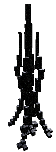 The Influence take form of a structure or model in roblox which cannot be view in Roblox Studio, at this form, it take appearance of a tall, vertically-stacked construct, resembling a spire or monolithic column, highly geometric, composed of numerous floating cubic or rectangular blocks that seem to orbit or spiral upward. The overall color scheme is very dark, nearly black.